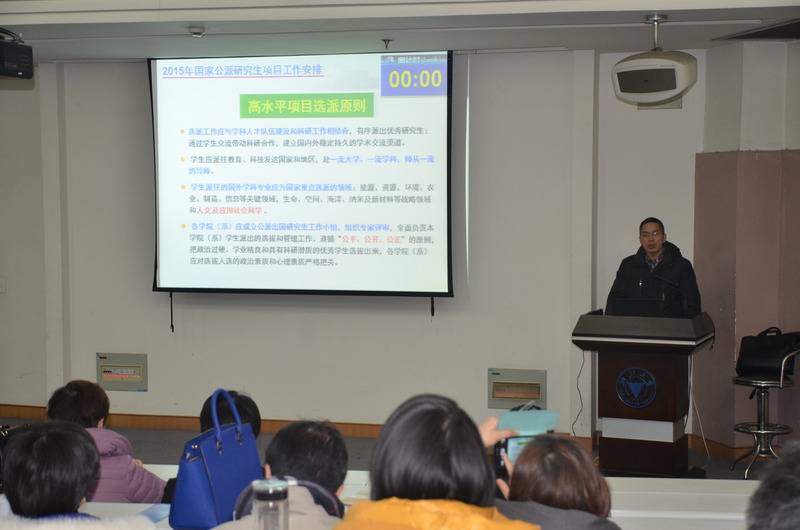 2015年12月22日上午,2015年“国家公派研究生项目”实施工作会议在紫金港校区蒙民伟楼223报告厅召开。研究生培养处叶恭银处长作工作布置,各院系分管研究生工作的院长、主任、书记及研究生科科长参加了会议。