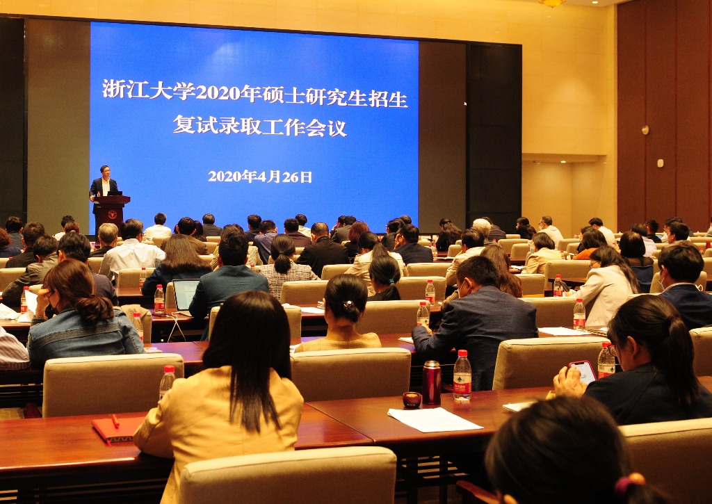 2020年4月27日上午,浙江大学2020年硕士研究生招生录取工作会议在紫金港校区求是大讲堂召开。学校研究生招生工作领导小组成员,各学院(系)分管领导、研究生科科长,研究生院及相关职能部门的负责人参加了会议。学校党委常委、副校长严建华,党委副书记邬小撑出席会议并作重要讲话。研究生招生处处长周文文对本次复试录取工作进行政策解读和工作布置。党委研究生工作部部长张荣祥结合网络远程复试的特殊场景就如何抓好思想政治和道德品质考核进行了业务指导。会议由研究生院院长包刚主持。