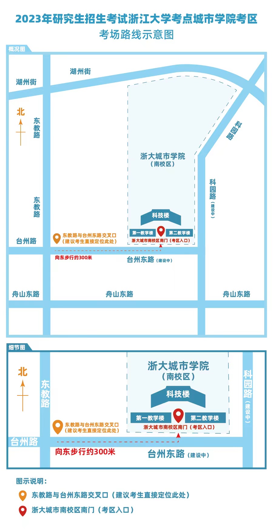 所有考生唯一入校和出校通道设置在南校区南门。考试地点为第一教学楼的考生从西侧通道进入;考试地点为第二教学楼的考生从东侧通道进入。(导航定位:东教路与台州东路交叉口,向东步行约需3分钟到考区入口。)